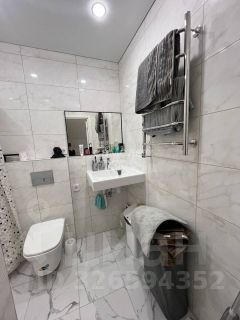 Санузел выложен керамогранитом, Оснащен подвесным унитазом, раковиной, на стирально-сушильной машине, пеналом, электрическим полотенцесушителем, оригинальным большим зеркалом нестандартной формы с LЕD-подсветкой и душевым уголком со стеклянными раздвижными дверцами.