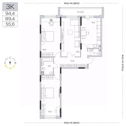 Продаётся 3-комнатная квартира в сданном доме (Корпус 14), срок сдачи: IV-кв. 2023, общей площадью 89.4 кв.м., на 3 этаже.