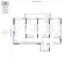 Продаётся 3-комнатная квартира в сданном доме (Корпус 13), срок сдачи: IV-кв. 2023, общей площадью 80.7 кв.м., на 3 этаже.