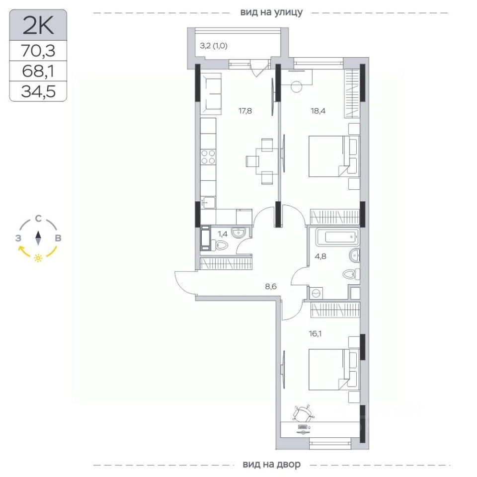 Продаётся 2-комнатная квартира в сданном доме (Корпус 13), срок сдачи: IV-кв. 2023, общей площадью 68.1 кв.м., на 7 этаже.