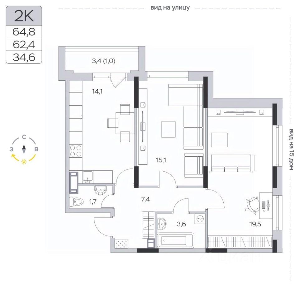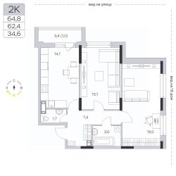 Продаётся 2-комнатная квартира в сданном доме (Корпус 13), срок сдачи: IV-кв. 2023, общей площадью 62.4 кв.м., на 9 этаже.