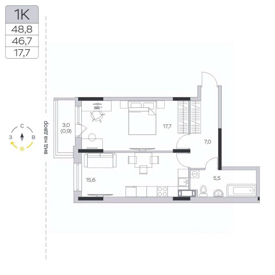 Продаётся 1-комнатная квартира в сданном доме (Корпус 15), срок сдачи: III-кв. 2024, общей площадью 46.7 кв.м., на 3 этаже.