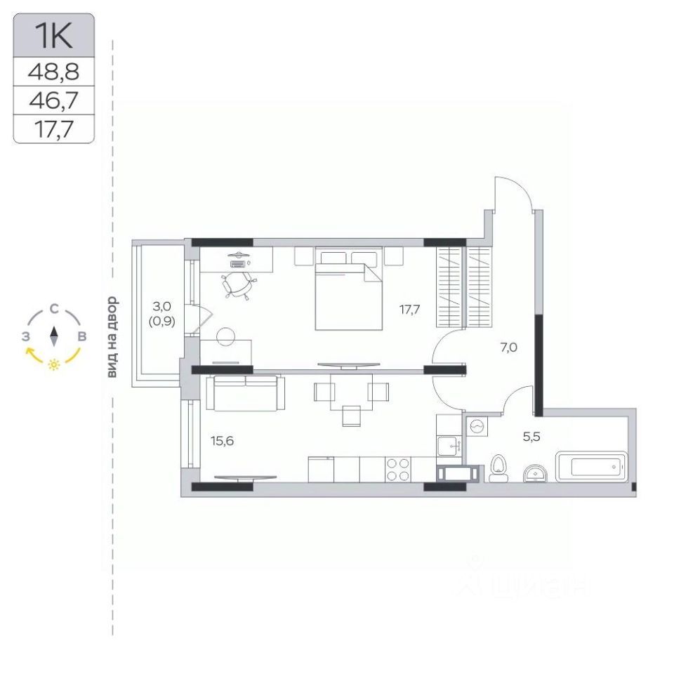 Продаётся 1-комнатная квартира в сданном доме (Корпус 15), срок сдачи: III-кв. 2024, общей площадью 46.7 кв.м., на 9 этаже.