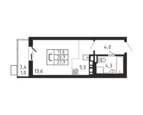 Продаётся студия в строящемся доме (Корпус 4), срок сдачи: II-кв. 2026, общей площадью 27.9 кв.м., на 5 этаже.