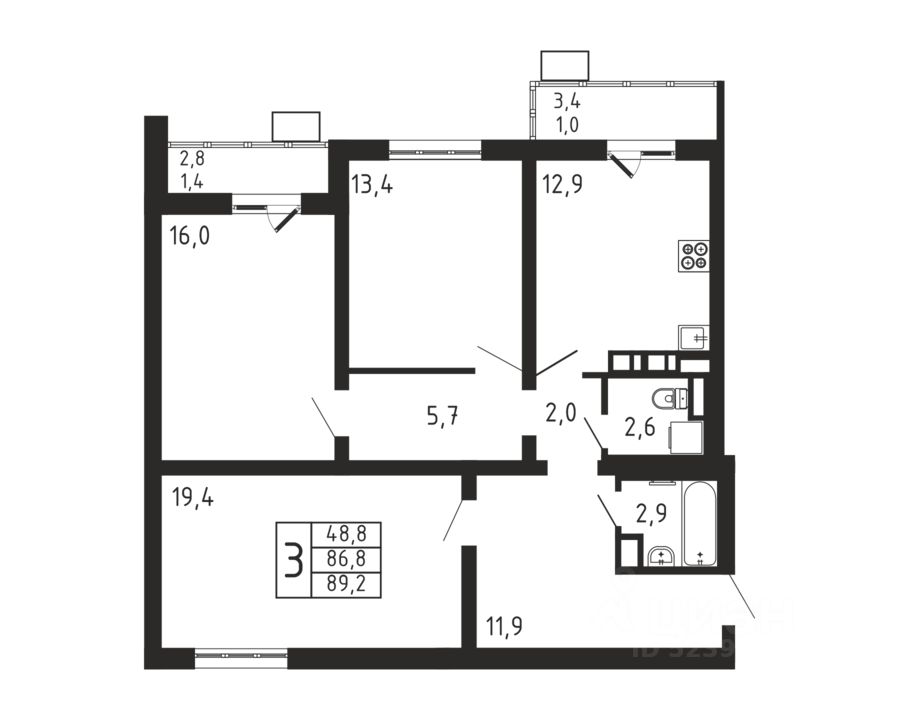 Продаётся 3-комнатная квартира в строящемся доме (Корпус 4), срок сдачи: II-кв. 2026, общей площадью 89.2 кв.м., на 2 этаже.