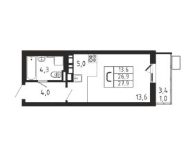 Продаётся студия в строящемся доме (Корпус 4), срок сдачи: II-кв. 2026, общей площадью 27.9 кв.м., на 8 этаже.