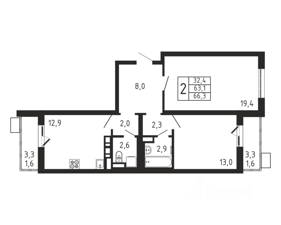 Продаётся 2-комнатная квартира в строящемся доме (Корпус 4), срок сдачи: II-кв. 2026, общей площадью 66.3 кв.м., на 2 этаже.