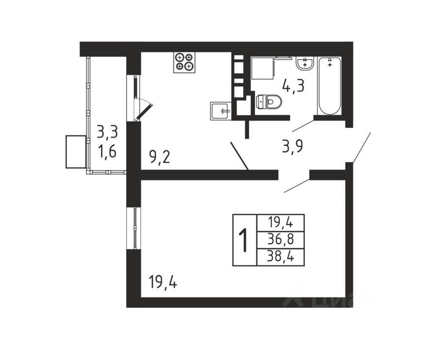 Продаётся 1-комнатная квартира в строящемся доме (Корпус 4), срок сдачи: II-кв. 2026, общей площадью 38.4 кв.м., на 9 этаже.