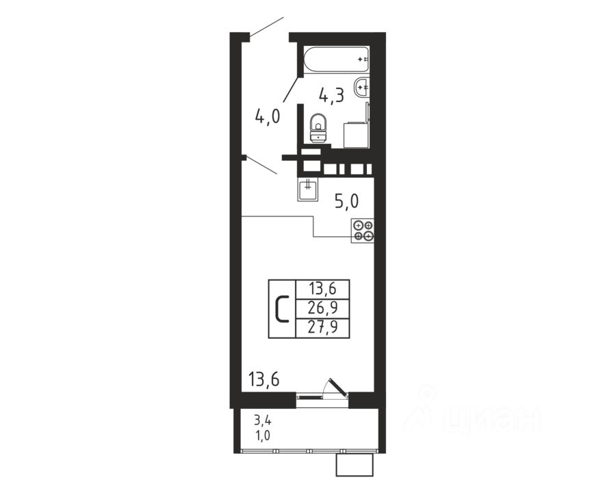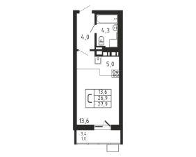 Продаётся студия в строящемся доме (Корпус 4), срок сдачи: II-кв. 2026, общей площадью 27.9 кв.м., на 7 этаже.