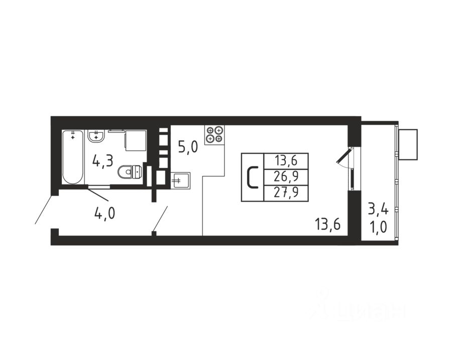Продаётся студия в строящемся доме (Корпус 4), срок сдачи: II-кв. 2026, общей площадью 27.9 кв.м., на 6 этаже.