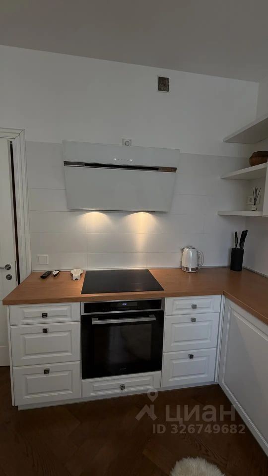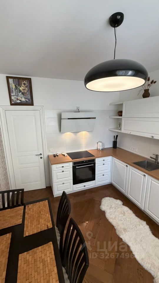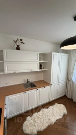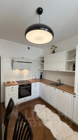 Площадь кухни составляет 11 кв.м. В кухонной зоне установлен кухонный гарнитур со встроенной бытовой техникой: варочной панелью, духовым шкафом, вытяжкой, холодильником, посудомоечной машиной известных брендов. Напольное покрытие-паркет, покрытие стен-обои.