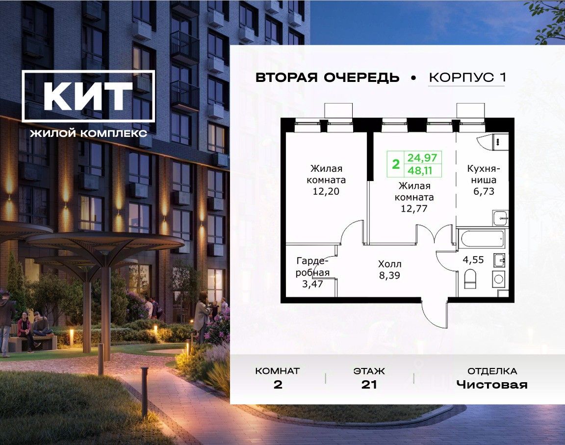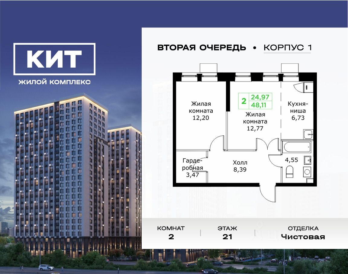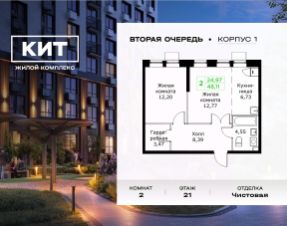 Продаётся 2-к квартира 48.11 кв.м. с чистовой отделкой в ЖК "КИТ2" на 21-м этаже 25 этажного дома.Жилой комплекс "Кит 2" спроектирован в урбанистической концепции "Город в Городе".