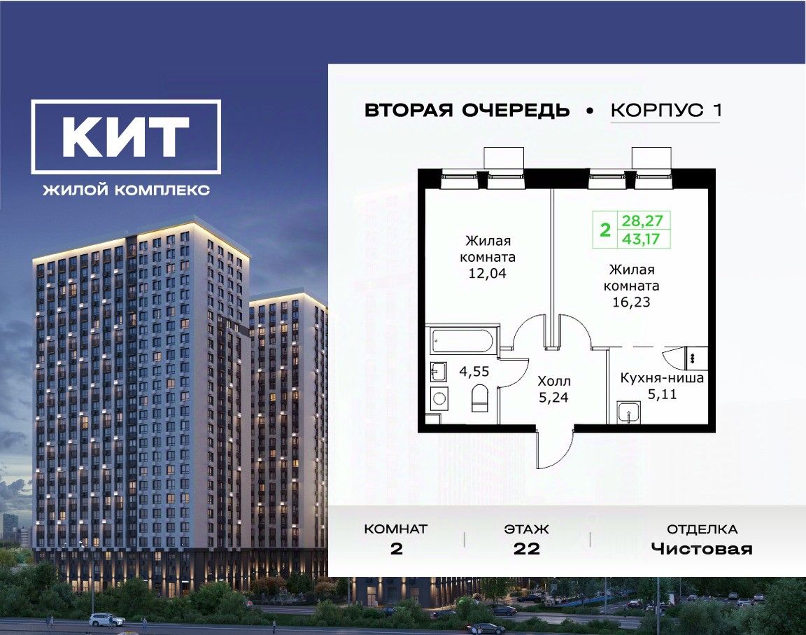 Продаётся 2-к квартира 43.17 кв.м. с чистовой отделкой в ЖК "КИТ2" на 22-м этаже 25 этажного дома.Жилой комплекс "Кит 2" спроектирован в урбанистической концепции "Город в Городе".