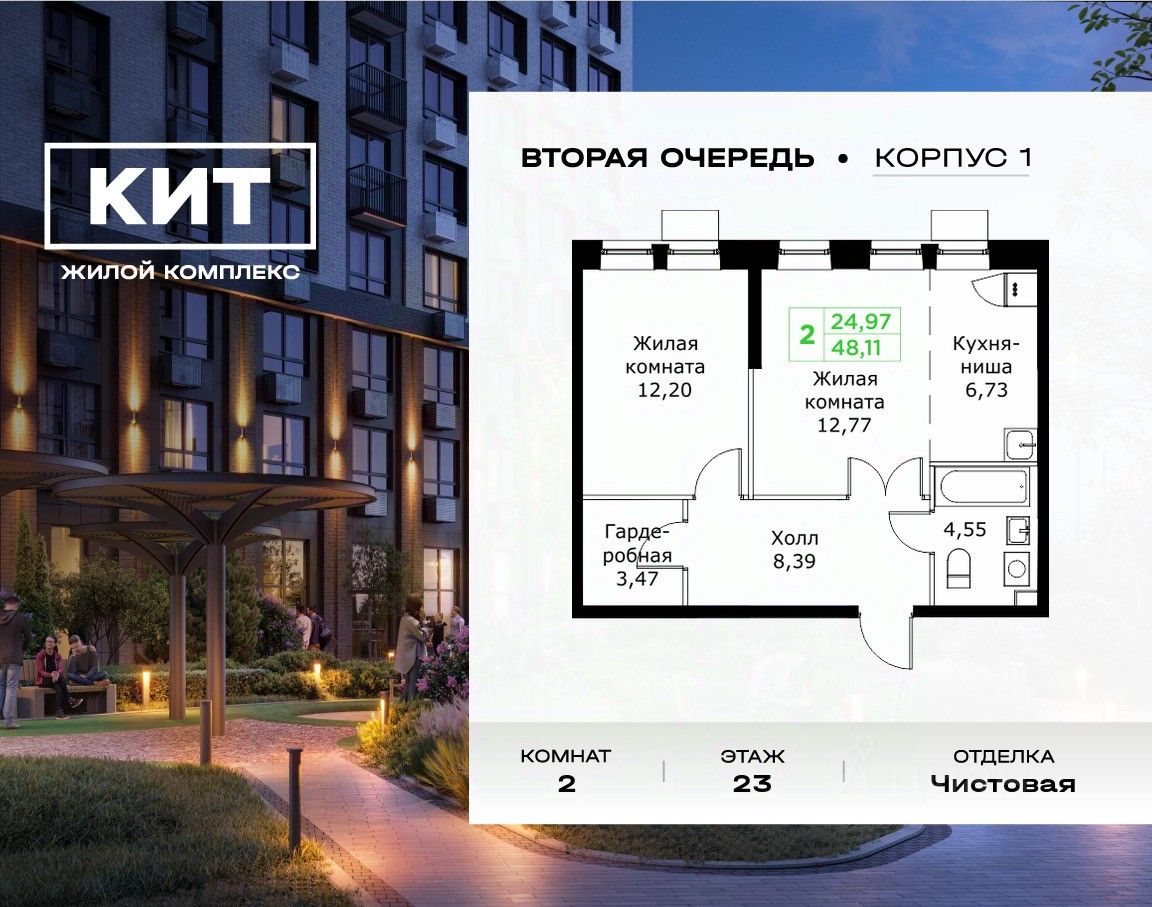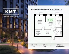 Продаётся 2-к квартира 48.11 кв.м. с чистовой отделкой в ЖК "КИТ2" на 23-м этаже 25 этажного дома.Жилой комплекс "Кит 2" спроектирован в урбанистической концепции "Город в Городе".