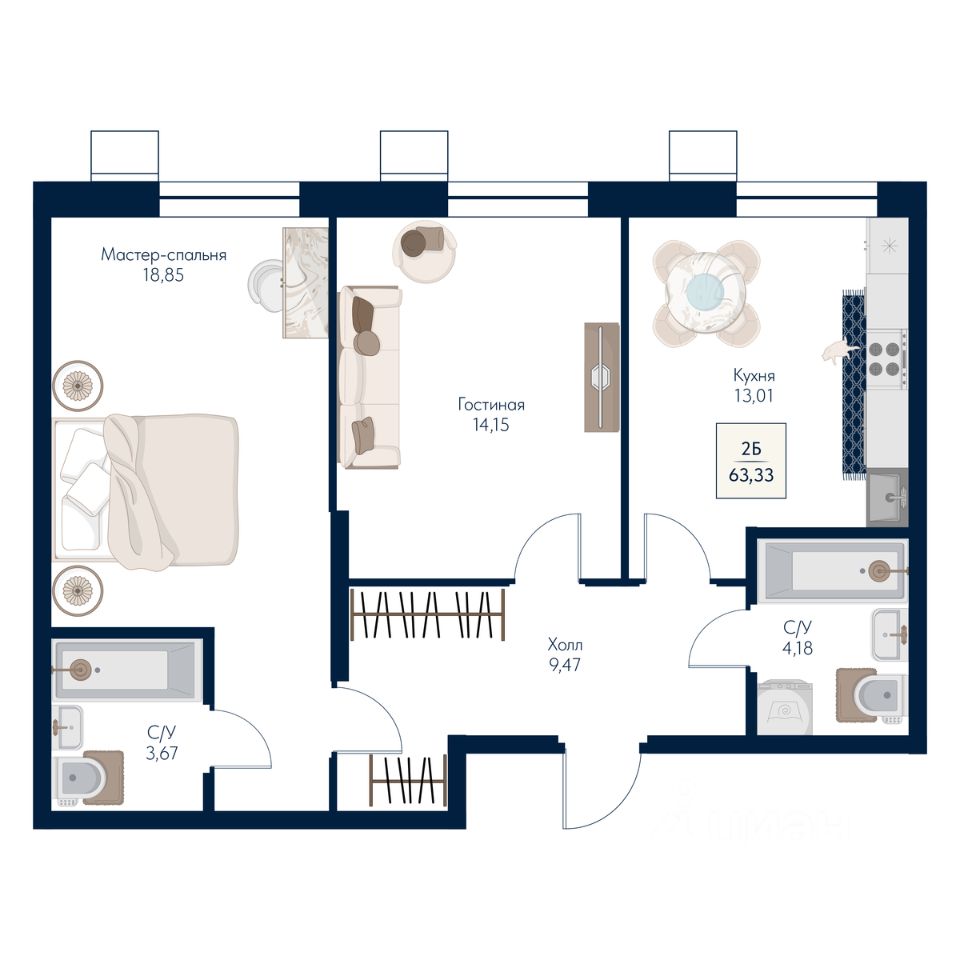 Общая площадь63,33 м²