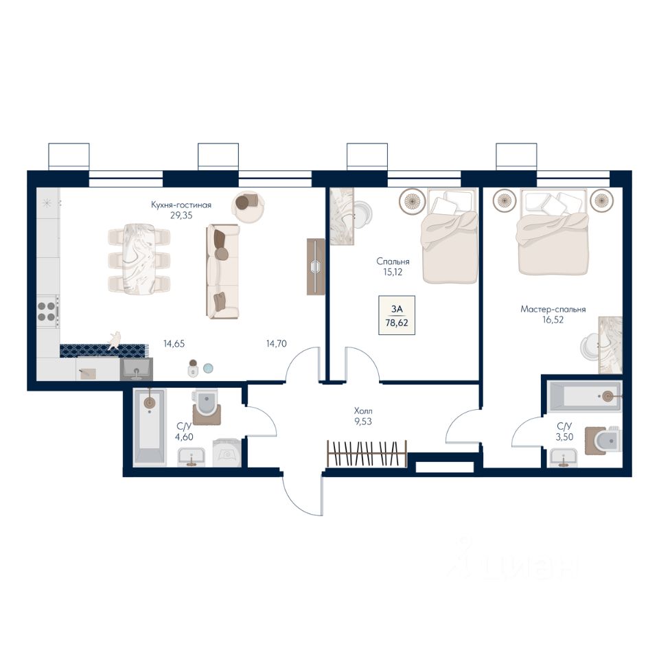Продаётся 3-комнатная квартира в строящемся доме (Секции 1-5), срок сдачи: III-кв. 2028, общей площадью 78.62 кв.м., на 3 этаже. Новый жилой комплекс "Бархат" от застройщика "СЗ Глобалмытищи" расположен по адресу: г. Мытищи, Ядреевская улица.