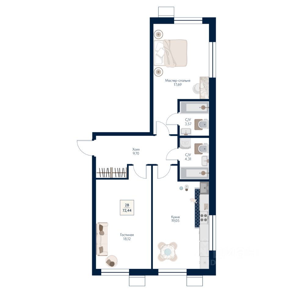 Продаётся 2-комнатная квартира в строящемся доме (Секции 1-5), срок сдачи: III-кв. 2028, общей площадью 72.44 кв.м., на 4 этаже. Новый жилой комплекс "Бархат" от застройщика "СЗ Глобалмытищи" расположен по адресу: г. Мытищи, Ядреевская улица.