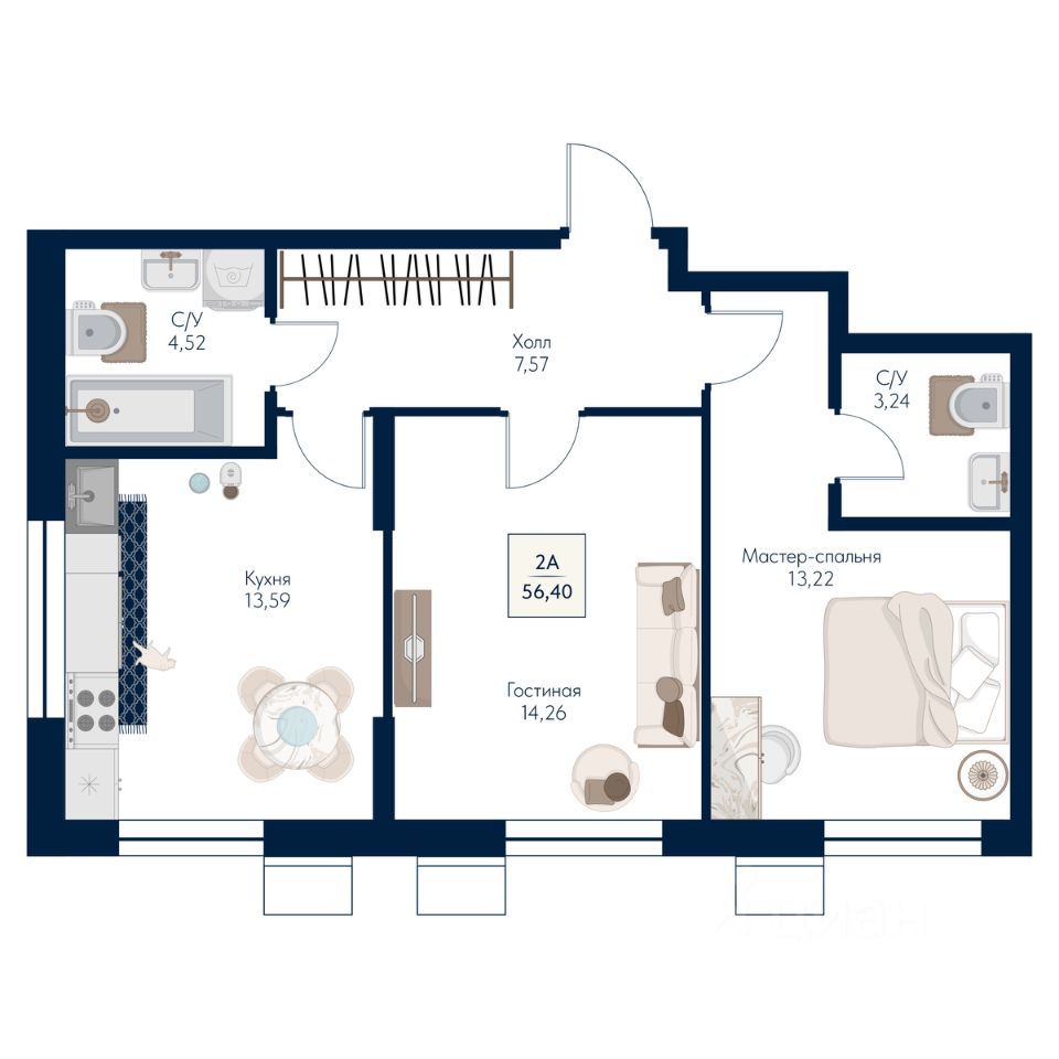 Продаётся 2-комнатная квартира в строящемся доме (Секции 1-5), срок сдачи: III-кв. 2028, общей площадью 56.4 кв.м., на 10 этаже. Новый жилой комплекс "Бархат" от застройщика "СЗ Глобалмытищи" расположен по адресу: г. Мытищи, Ядреевская улица.