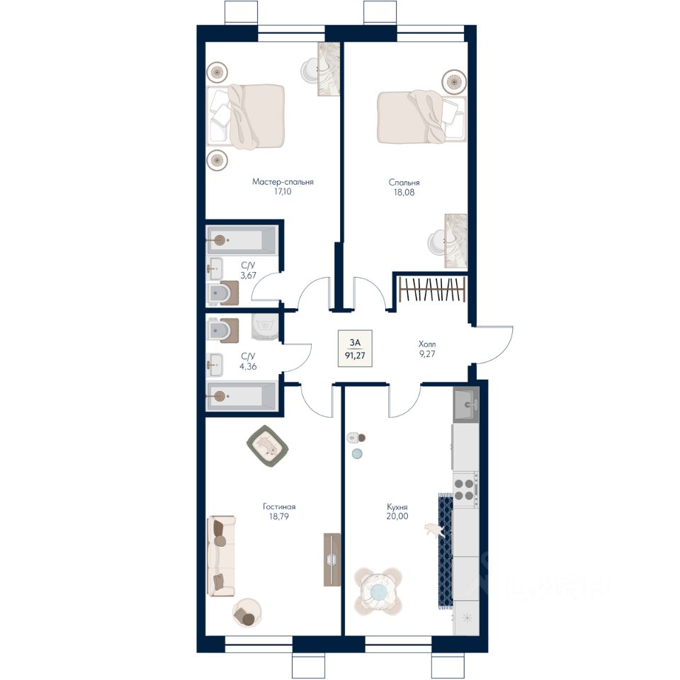 Общая площадь91,27 м²