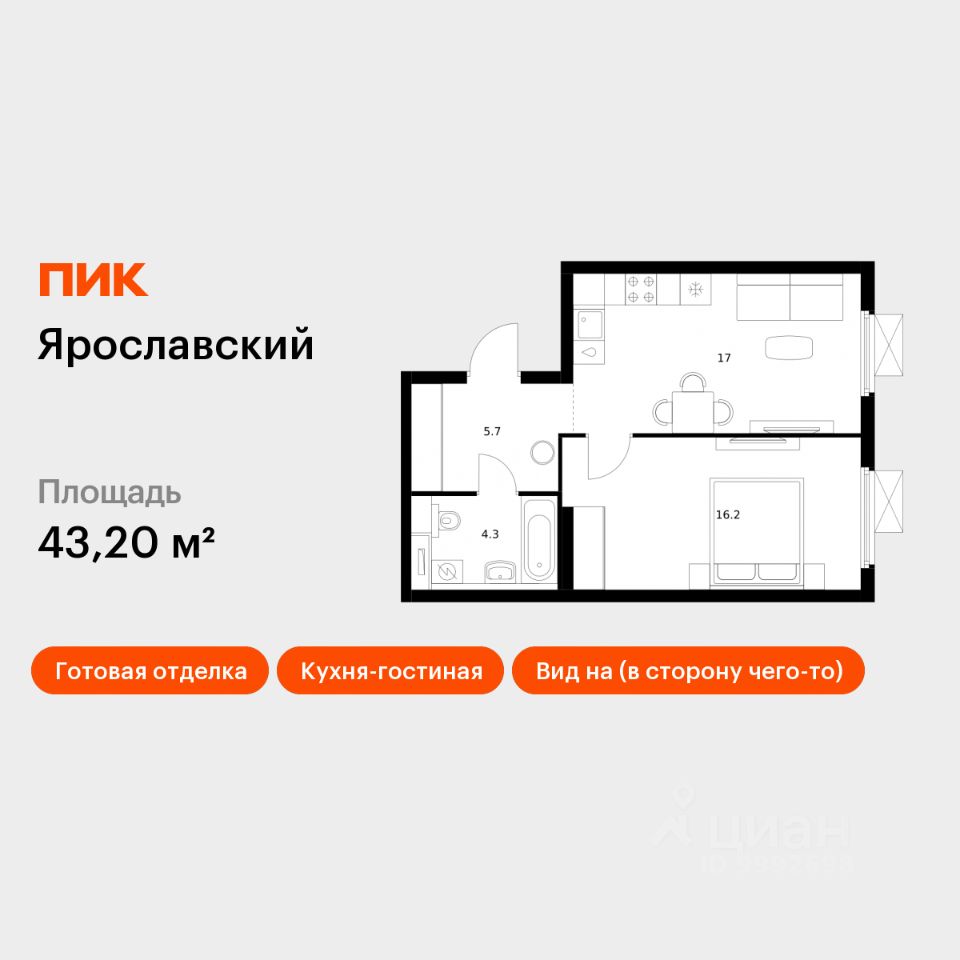 Продаётся 1-комн. квартира площадью 43,2 кв.м на 14 этаже 25 этажного дома (Корпус 16.2, Секция 2) проекта ПИК Ярославский. Светлый просторный подъезд на уровне земли, функциональная планировка, большие окна, c отделкой.