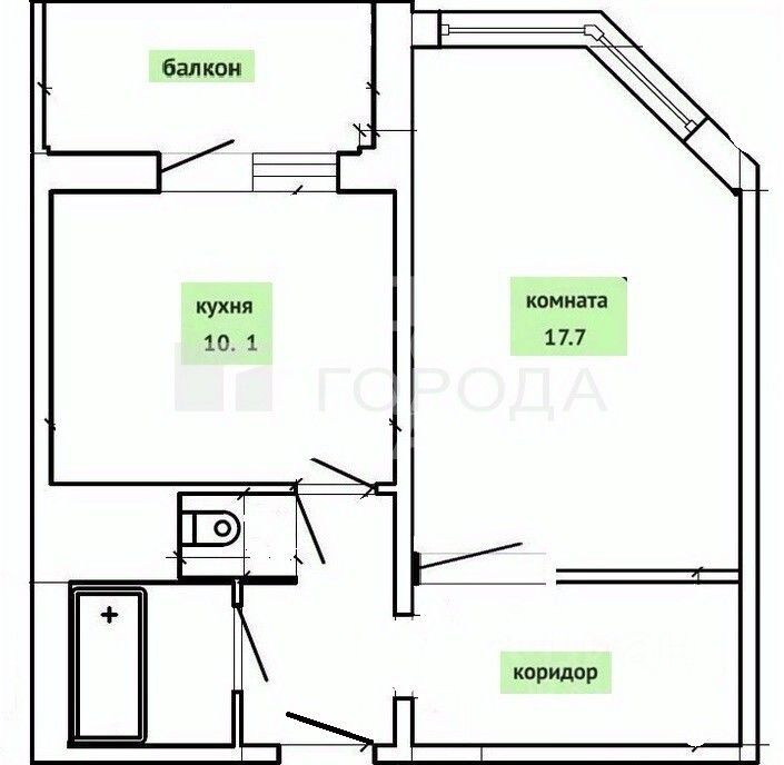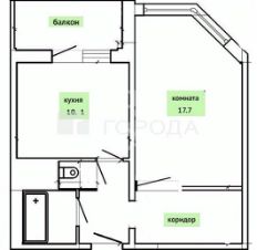 Квартира имеет удачную для однокомнатной планировку с большой кухней, просторной комнатой и нишей под большую гардеробную.