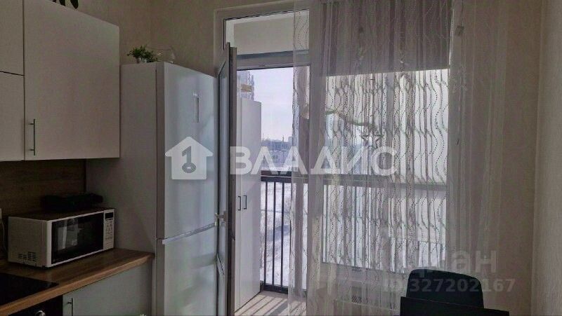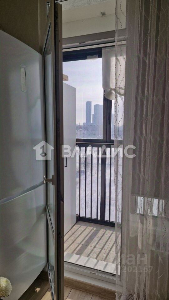 Большая панорамная лоджия на кухне с видом на Москву, на лоджии стоит шкаф для вещей.