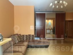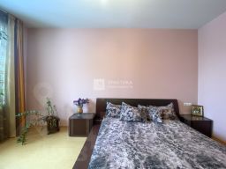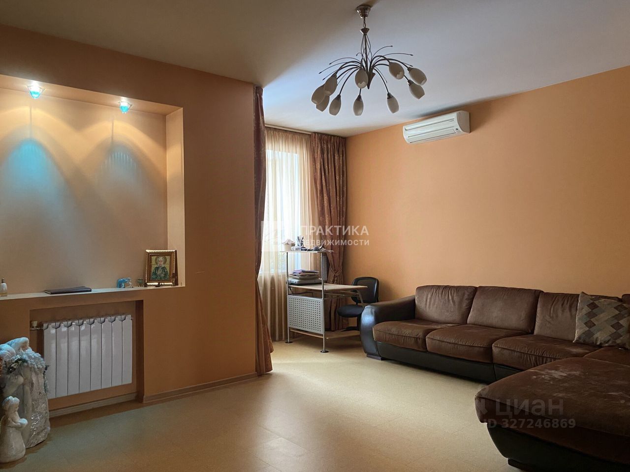 Основная комната — интерьер выполнен в спокойных, тёплых тонах (оранжево-коричневые оттенки). Просторный угловой диван — идеальное место для отдыха. Ниша с подсветкой — стильное решение для размещения семейных фотографий. Увеличенные окна наполняют комнату естественным светом . Установлен кондиционер, который охватывает полностью всю квартиру на охлаждение в летний период. Лоджия утеплена, установлен электрический радиатор отопления, стены отделаны пробкой.