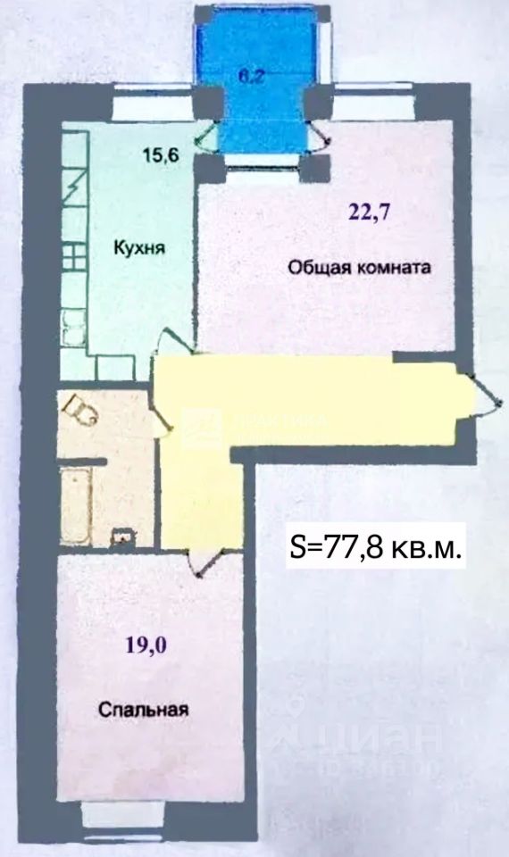 Продуманная планировка: коридор, справа основная комната 22 кв.м. с выходом на утепленную лоджию, прямо кухня-гостиная 15.6 кв.м., санузел, слева спальня 19 кв.м.