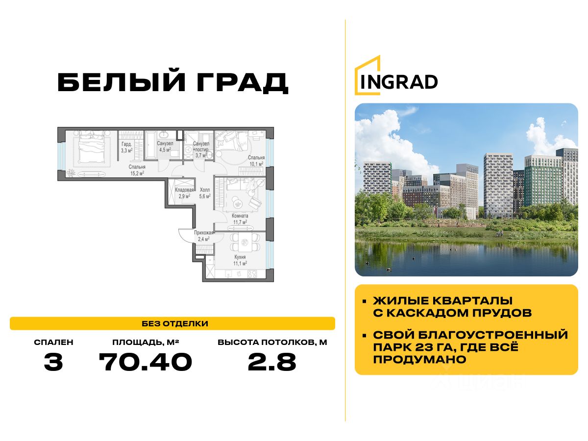 Прямая продажа от девелопера. В жилом квартале комфорт-класса "Белый Град" (девелопер ingrad) продаётся 3-спальная квартира площадью 70.40 кв.м без отделки. Квартира расположена на 11 этаже 17-этажного дома, корпус 12.1.