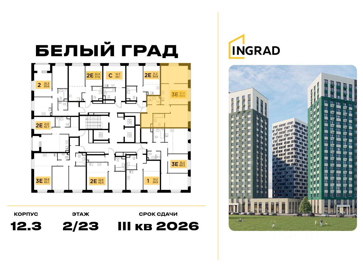 Прямая продажа от девелопера. В жилом квартале комфорт-класса "Белый Град" (девелопер ingrad) продаётся 2-спальная квартира площадью 69.50 кв.м без отделки. Квартира расположена на 14 этаже 23-этажного дома, корпус 12.3.