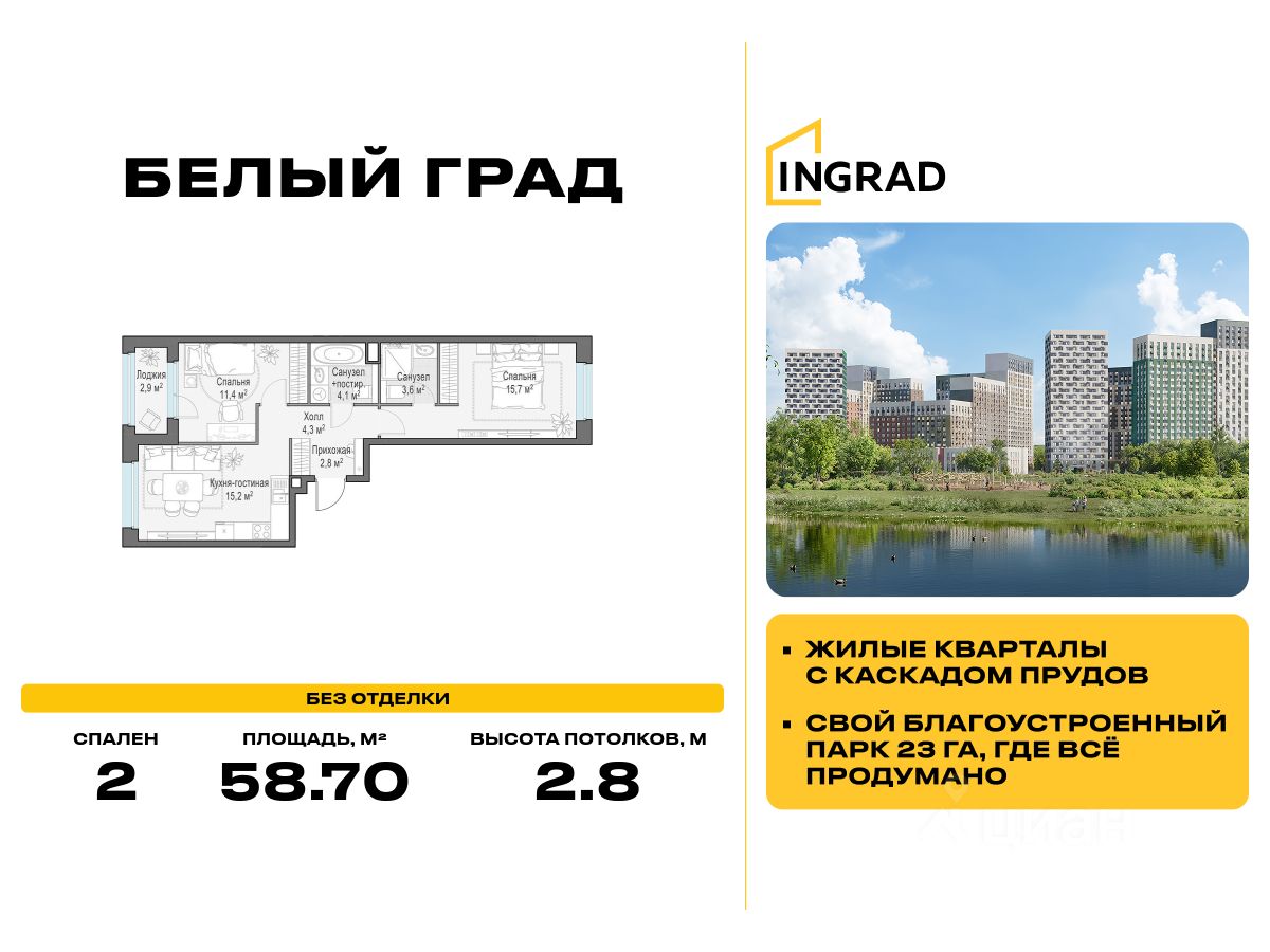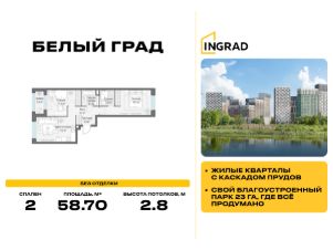 Прямая продажа от девелопера. В жилом квартале комфорт-класса "Белый Град" (девелопер ingrad) продаётся 2-спальная квартира площадью 58.70 кв.м без отделки. Квартира расположена на 2 этаже 20-этажного дома, корпус 11.2.