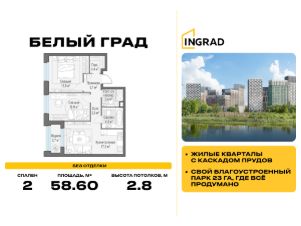 Прямая продажа от девелопера. В жилом квартале комфорт-класса "Белый Град" (девелопер ingrad) продаётся 2-спальная квартира площадью 58.60 кв.м без отделки. Квартира расположена на 11 этаже 12-этажного дома, корпус 11.2.