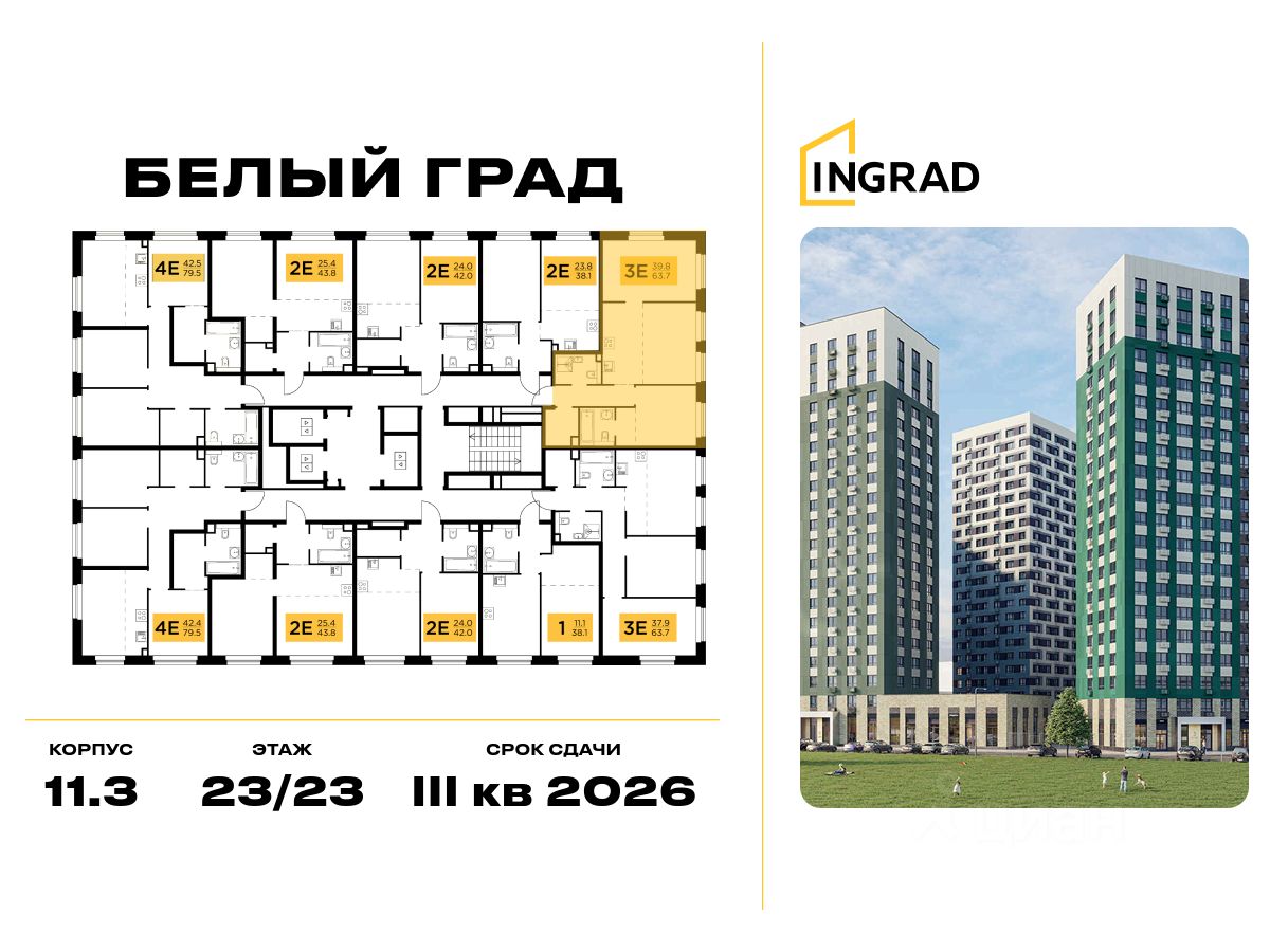 Прямая продажа от девелопера. В жилом квартале комфорт-класса "Белый Град" (девелопер ingrad) продаётся 2-спальная квартира площадью 63.70 кв.м без отделки. Квартира расположена на 23 этаже 23-этажного дома, корпус 11.3.