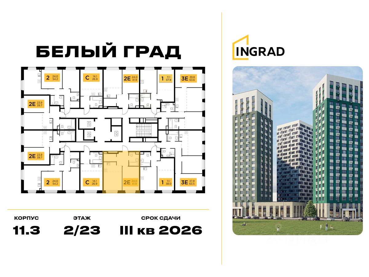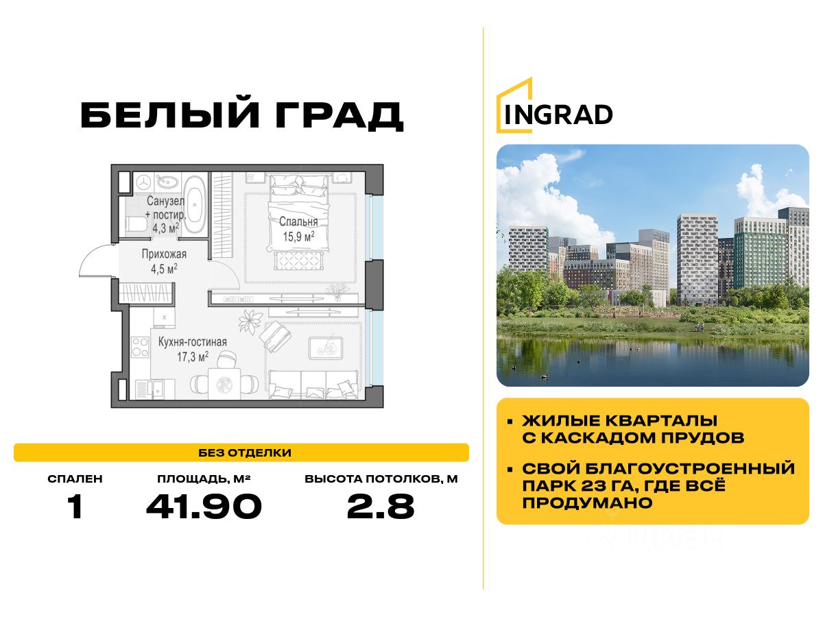 Прямая продажа от девелопера. В жилом квартале комфорт-класса "Белый Град" (девелопер ingrad) продаётся 1-спальная квартира площадью 41.90 кв.м без отделки. Квартира расположена на 2 этаже 23-этажного дома, корпус 11.3.