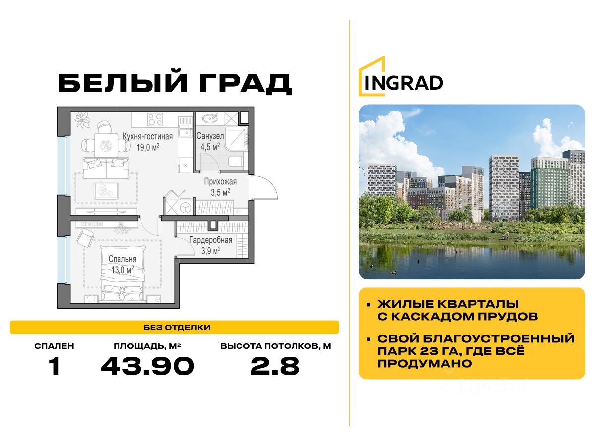 Прямая продажа от девелопера. В жилом квартале комфорт-класса "Белый Град" (девелопер ingrad) продаётся 1-спальная квартира площадью 43.90 кв.м без отделки. Квартира расположена на 22 этаже 23-этажного дома, корпус 11.3.