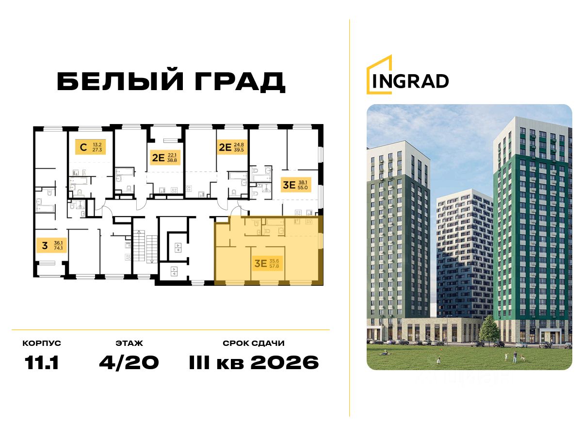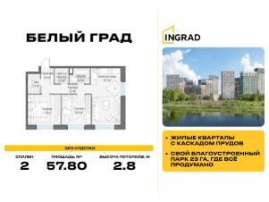 Прямая продажа от девелопера. В жилом квартале комфорт-класса "Белый Град" (девелопер ingrad) продаётся 2-спальная квартира площадью 57.80 кв.м без отделки. Квартира расположена на 8 этаже 20-этажного дома, корпус 11.1.