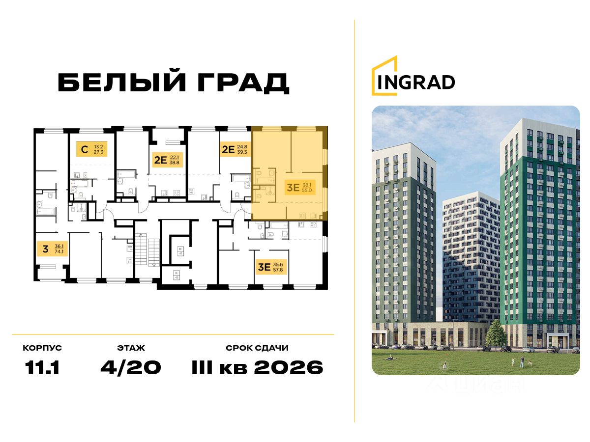 Прямая продажа от девелопера. В жилом квартале комфорт-класса "Белый Град" (девелопер ingrad) продаётся 2-спальная квартира площадью 55.00 кв.м без отделки. Квартира расположена на 11 этаже 20-этажного дома, корпус 11.1.