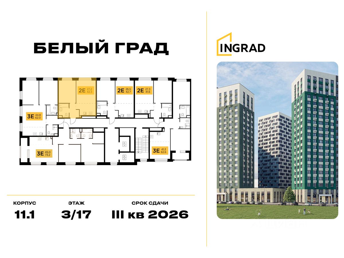 Прямая продажа от девелопера. В жилом квартале комфорт-класса "Белый Град" (девелопер ingrad) продаётся 1-спальная квартира площадью 42.30 кв.м без отделки. Квартира расположена на 11 этаже 17-этажного дома, корпус 11.1.