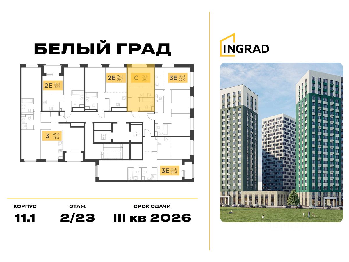 Прямая продажа от девелопера. В жилом квартале комфорт-класса "Белый Град" (девелопер ingrad) продаётся студия площадью 26.10 кв.м без отделки. Квартира расположена на 2 этаже 23-этажного дома, корпус 11.1.