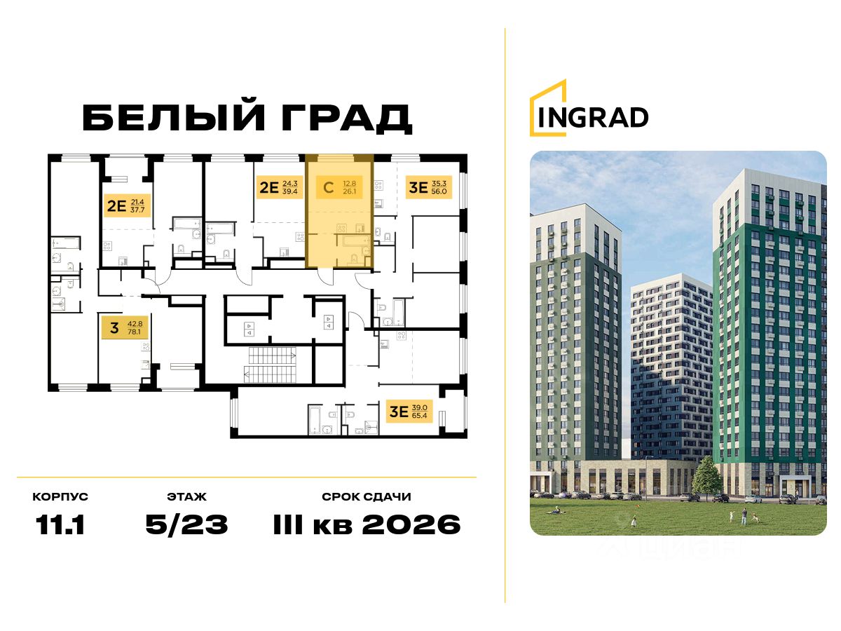 Прямая продажа от девелопера. В жилом квартале комфорт-класса "Белый Град" (девелопер ingrad) продаётся студия площадью 26.10 кв.м без отделки. Квартира расположена на 5 этаже 23-этажного дома, корпус 11.1.