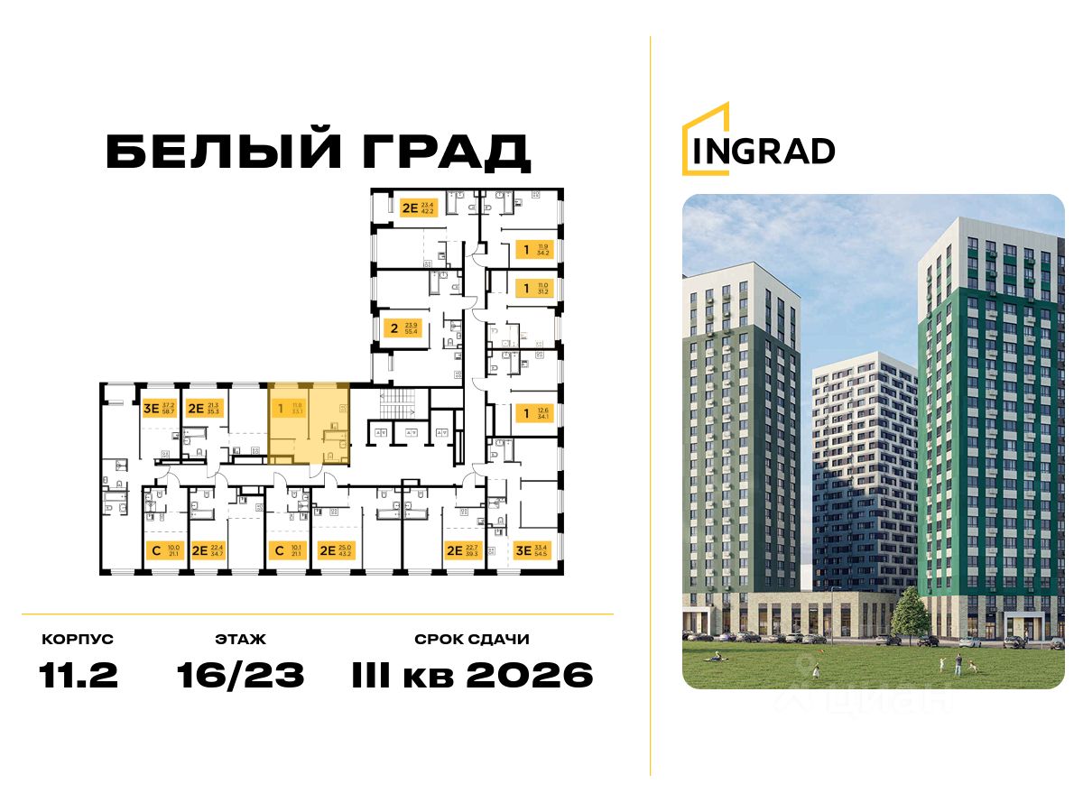 Прямая продажа от девелопера. В жилом квартале комфорт-класса "Белый Град" (девелопер ingrad) продаётся 1-спальная квартира площадью 33.10 кв.м без отделки. Квартира расположена на 18 этаже 23-этажного дома, корпус 11.2.