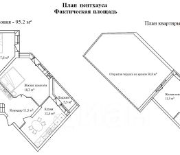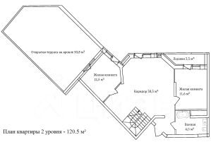 - 2 уровень: просторный холл 38,3 м2; ванная комната 4 м2; жилая комната 11,6 м2 с лоджией 3,3 м2 и жилая комната 12,5 м2 с выходом на личную террасу 50,8 м2.