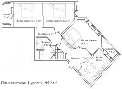 - 1 уровень: прихожая 11,5 м2 и коридор 7,3 м2; кухня 12,5 м2 с лоджией 3,3 м2; две жилые комнаты 17,8 и 18,3 м2 с французскими балконами и жилая комната 15,5 м2 с лоджией 3,2 м2; ванная комната 5,8 м2.