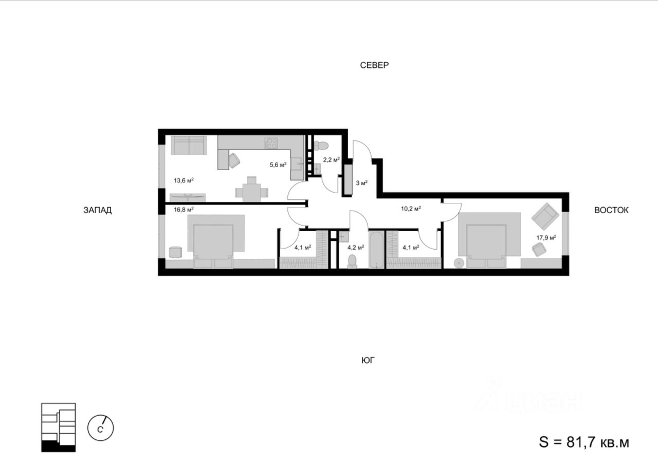 Продаётся 3-комнатная квартира в строящемся доме (Корпус 1), срок сдачи: I-кв. 2026, общей площадью 81.7 кв.м., на 13 этаже. Многоквартирный жилой дом со встроенно-пристроенными нежилыми помещениями и автостоянкой