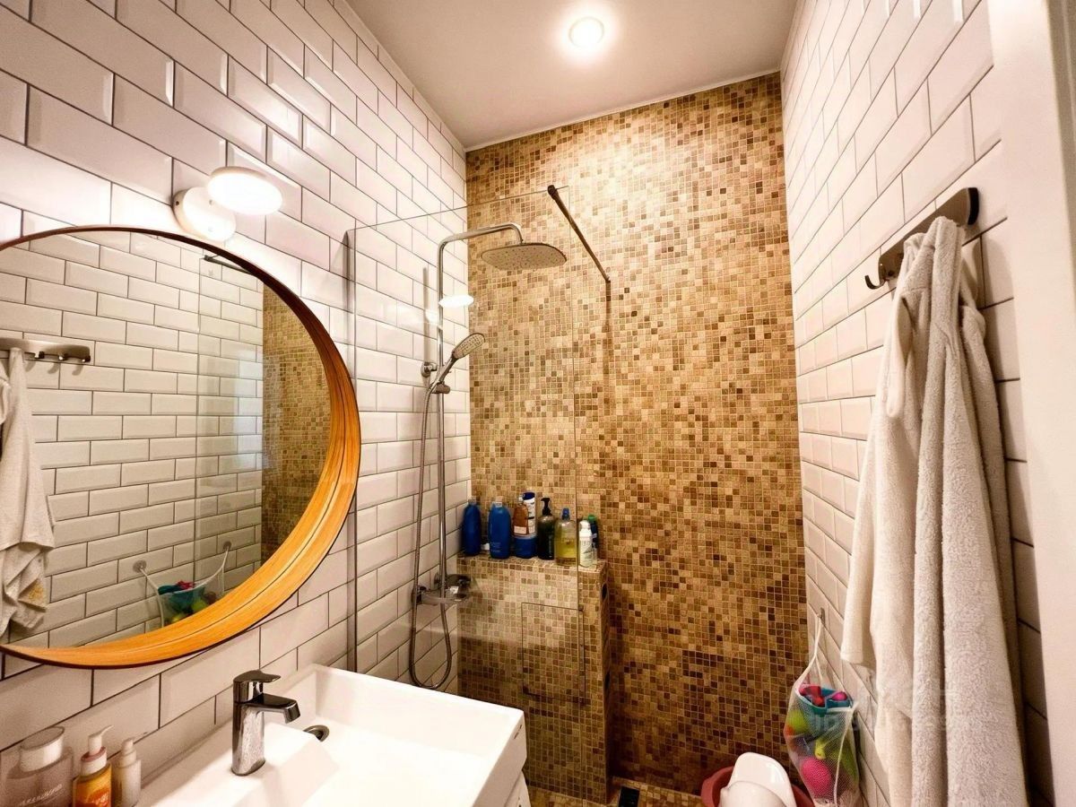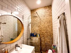 - В санузле плитка KERAMA MARAZZI, сантехника Grohenberg, тропический душ, электрический полотенцесушитель, дверь с эмалевым покрытием, качественная фурнитура.