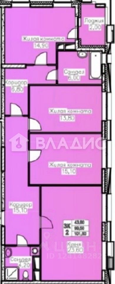 Окна выходят на улицу и во двор, обеспечивая достаточное естественное освещение. В квартире три изолированные комнаты с площадями 14,9 кв. м, 13,8 кв. м и 15,1 кв. м, просторная кухня площадью 23,6 кв. м и две совмещённые ванные комнаты. Также есть лоджия, где можно разместить зону отдыха.