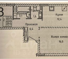Площадь: 51,4 м² (жилая — 27,9 м², просторная кухня — 12,4 м²)