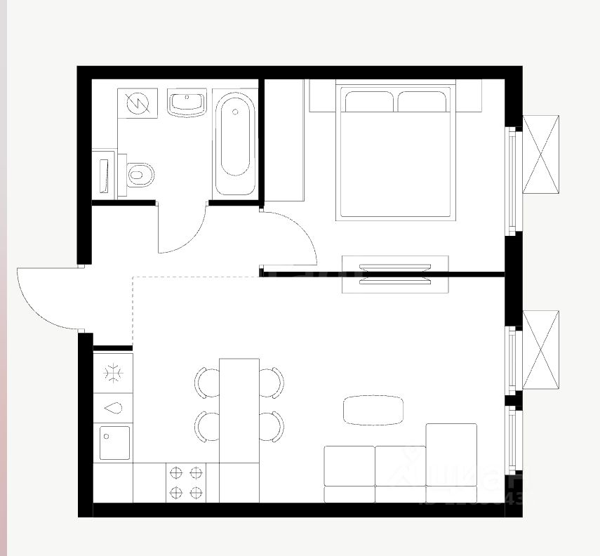 Высота потолков 2,7 метра и увеличенные окна наполняют пространство светом.
