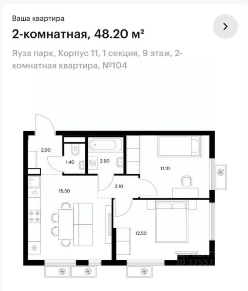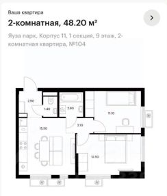 Арт. 92547469. Чистовая отделка! Вашему вниманию предлагается 2-х комнатная квартира в современном жилом комплексе "Яуза парк", корпус 11, расположенном в городе Мытищи Московской области всего в 4 км от МКАД по Ярославскому шоссе. Срок сдачи: 4-й квартал 2027 года. В настоящий момент ведется монтаж верхних этажей (см. фото). 24-этажный современный монолитный дом комфорт класса, 9-ый этаж. Квартира с комфортной продуманной планировкой. Общая площадь: 48,2 кв.м., изолированные комнаты: 12,5 и 11,1 кв.м., кухня-гостиная 15,3 кв.м., санузел раздельный. Чистовая отделка от застройщика, Вам останется купить только мебель!