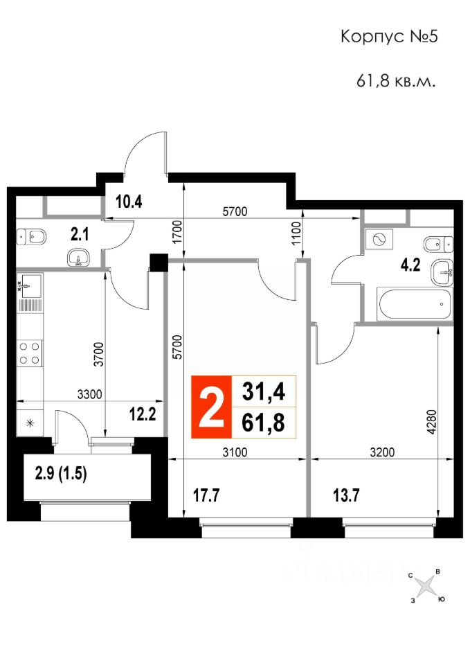 2-комн. квартира, 61,8 м²